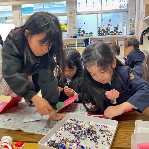 金色や銀色の折り紙をパンチで型抜きし、思い思いに貼り付けたり、スパンコールを飾っ
