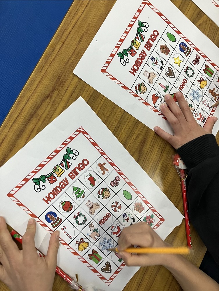 月に一度の英語あそび、今月は12/17(水)にクリスマスをテーマに実施しました。まずはクリスマスに関するワードカードを使って確認した後、クリスマスビンゴをしました。ビンゴになったらクリスマスのえんぴつ&消しゴムの景品をゲット!サンタや雪だるま、トナカイなどの消しゴムの中からどれにしょうかな??とワクワクしながら嬉しそうに選んでいました。また1年生はサンタさんの絵本に興味深々に聞き入ってました。早く寝ないとサンタさんは来ないよ~!と言う絵本でした。2.3年生はサンタの福笑いをしました。アップ、ダウン、ライト、レフトなどこども達にナビゲートしてもらい、ハンサムなサンタができあがりました。最後におなじみのサイモンゲームのクリスマスバージョンをして、盛り上がりました。