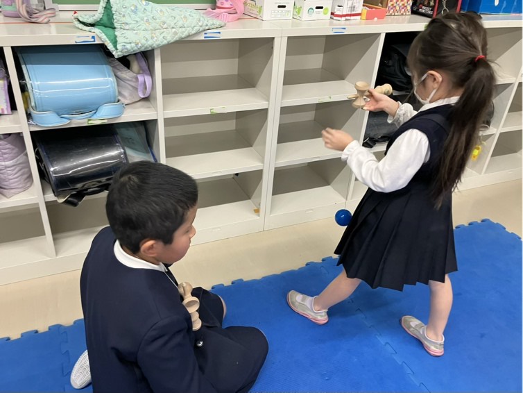 3年生に「1年生にけん玉を教えてあげて」とお願いしたら、快く引き受けてくれました。1年生はあまり遊んだことのない3年生に少し緊張気味でしたが、3年生が持ち方から優しく教えてくれたので楽しんでいる様子でした。保護者の方がお迎えに来られた際には「大皿に2回も乗ったよ!」と嬉しそうに話していました。こども達のほのぼのとした場面でした。