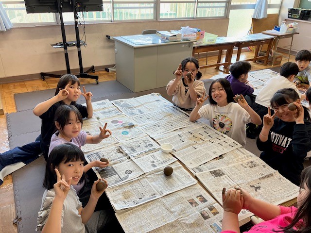 今年初めての行事として「泥だんご作り」をしました。購入した土に水を混ぜ、泥を真ん丸にまるめ、割れないように丁寧に磨き、思い思いの色と柄を考えました。手を泥だらけ絵の具だらけにしながら多くの工程を頑張りました。そして、色とりどりのカチカチ、ピッカピカ、世界で一つ自分だけの泥だんごを作り上げました。子とも達の晴れやかな笑顔をご覧ください。