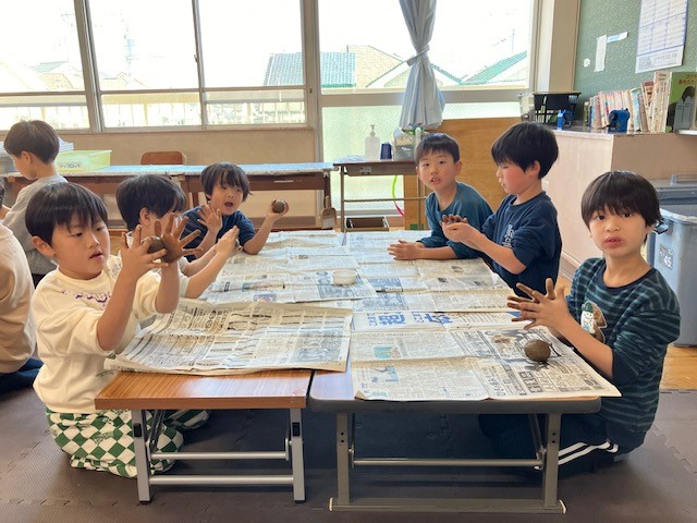 今年初めての行事として「泥だんご作り」をしました。購入した土に水を混ぜ、泥を真ん丸にまるめ、割れないように丁寧に磨き、思い思いの色と柄を考えました。手を泥だらけ絵の具だらけにしながら多くの工程を頑張りました。そして、色とりどりのカチカチ、ピッカピカ、世界で一つ自分だけの泥だんごを作り上げました。子とも達の晴れやかな笑顔をご覧ください。