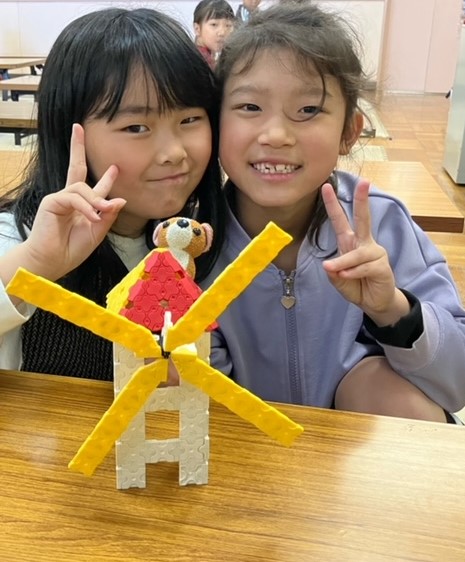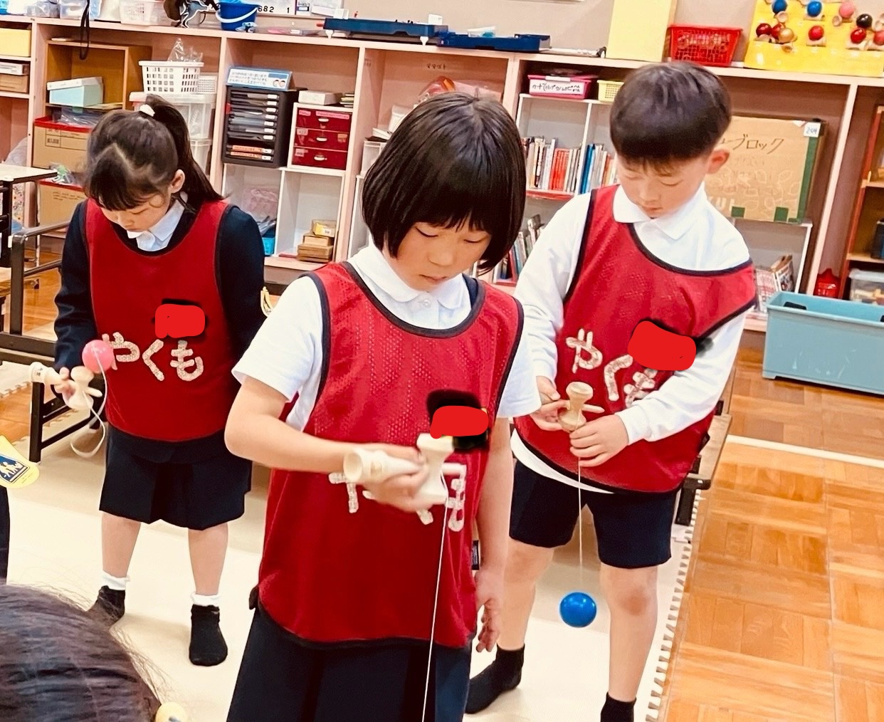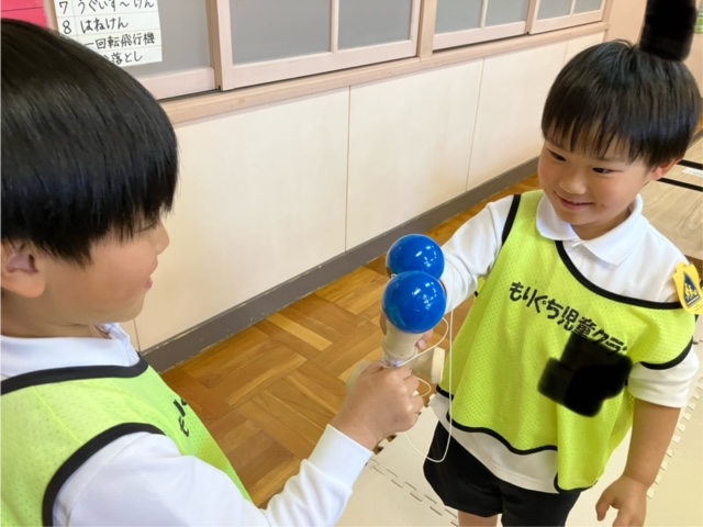 1組と2組で合同練習をしました。支援員が見本になってけん玉の